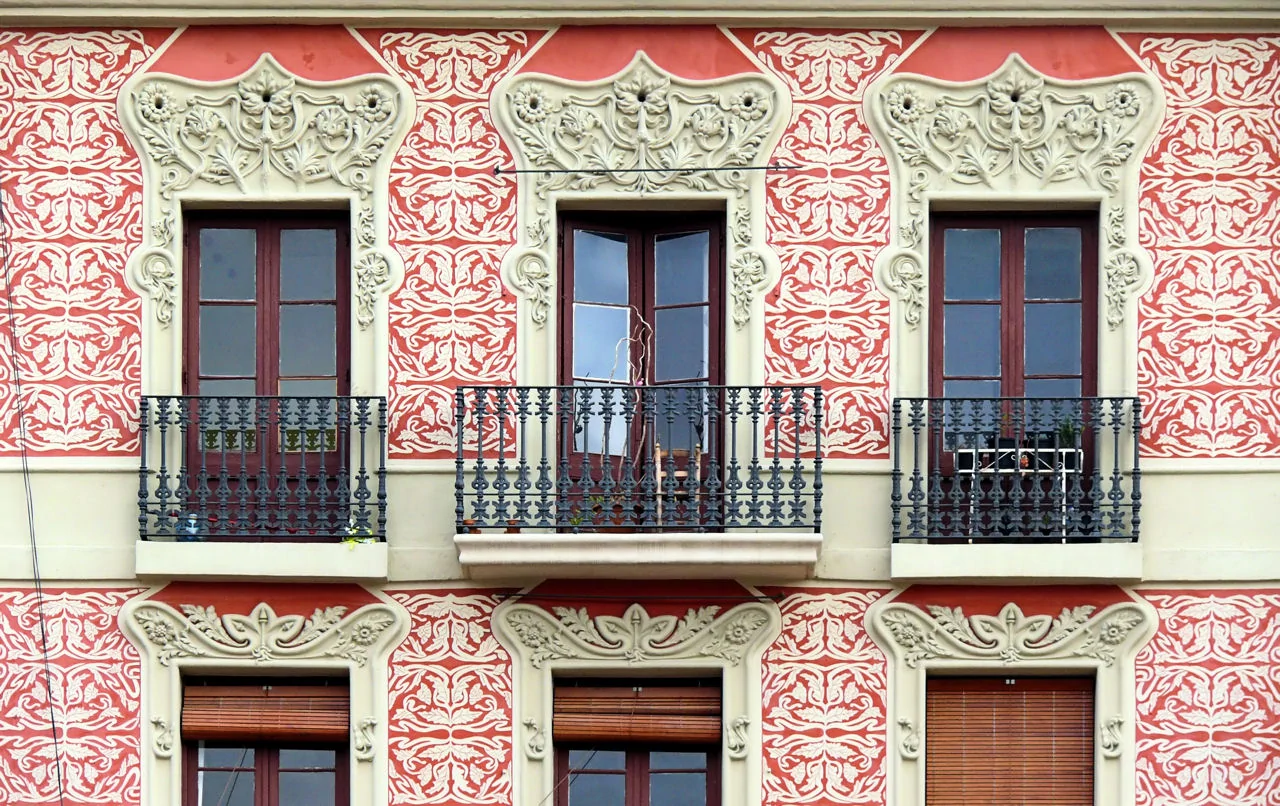 Представленное изображение демонстрирует великолепный пример модернистского фасада в испанском или португальском стиле. Фасад здания отличается изысканной отделкой с богатым красным орнаментальным узором, покрывающим большую часть стены, что создает яркий контраст с кремовыми элементами декора.