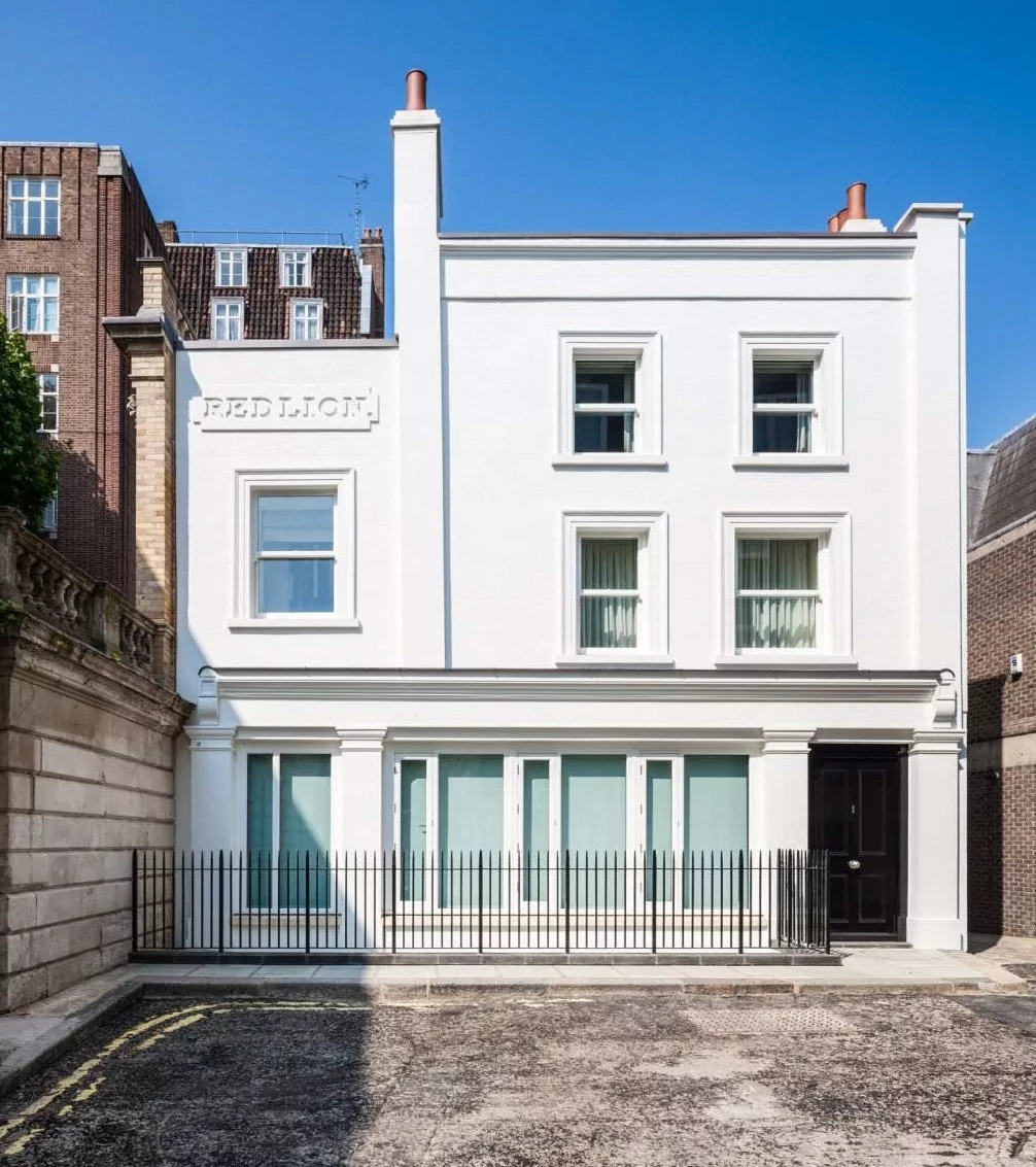Перед нами стоит элегантное белое здание, которое демонстрирует классическое городское архитектурное решение. Фасад здания, ранее известного как "Red Lion" (судя по сохранившейся надписи на фронтоне), выполнен в минималистичном стиле с акцентом на пропорции и симметрию. Трехэтажное строение обладает четкими геометрическими линиями и выделяется на фоне соседних кирпичных зданий своим белоснежным цветом.